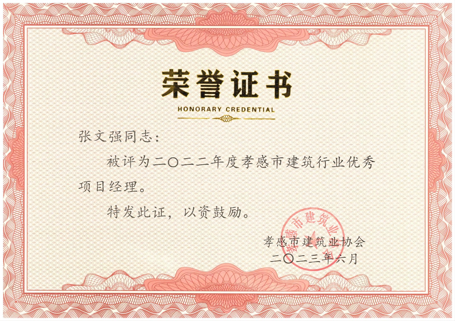 2023年度孝感市建筑行業(yè)優(yōu)秀項(xiàng)目經(jīng)理-秦銳...祝賀秦銳同志被評(píng)為2023年度孝感市建筑行業(yè)優(yōu)秀項(xiàng)目經(jīng)理...